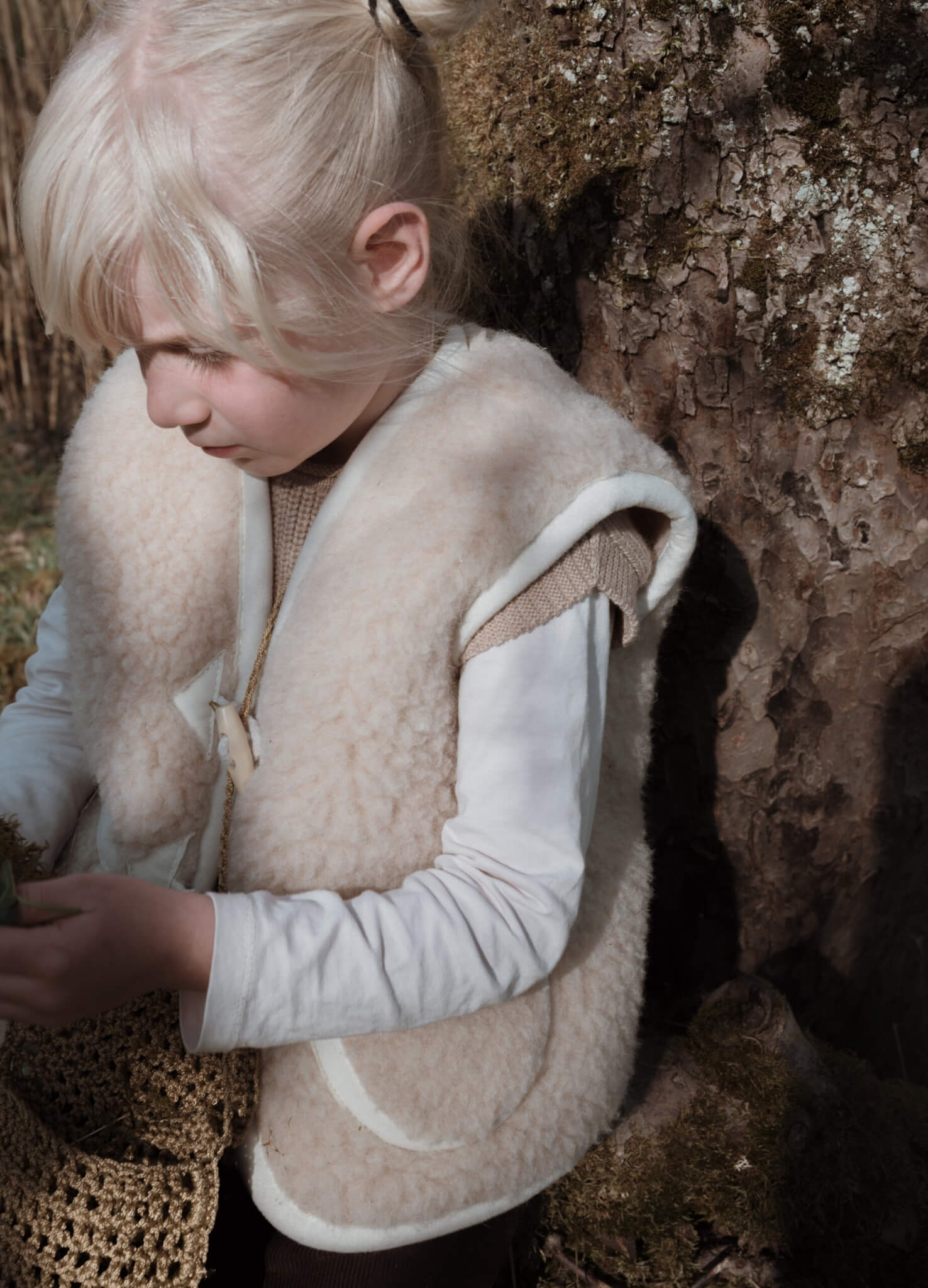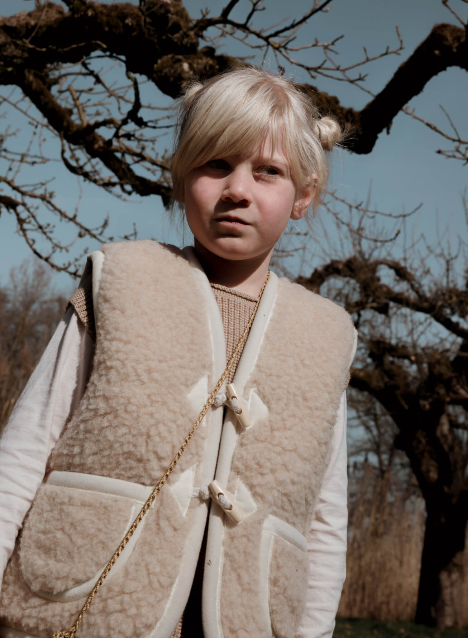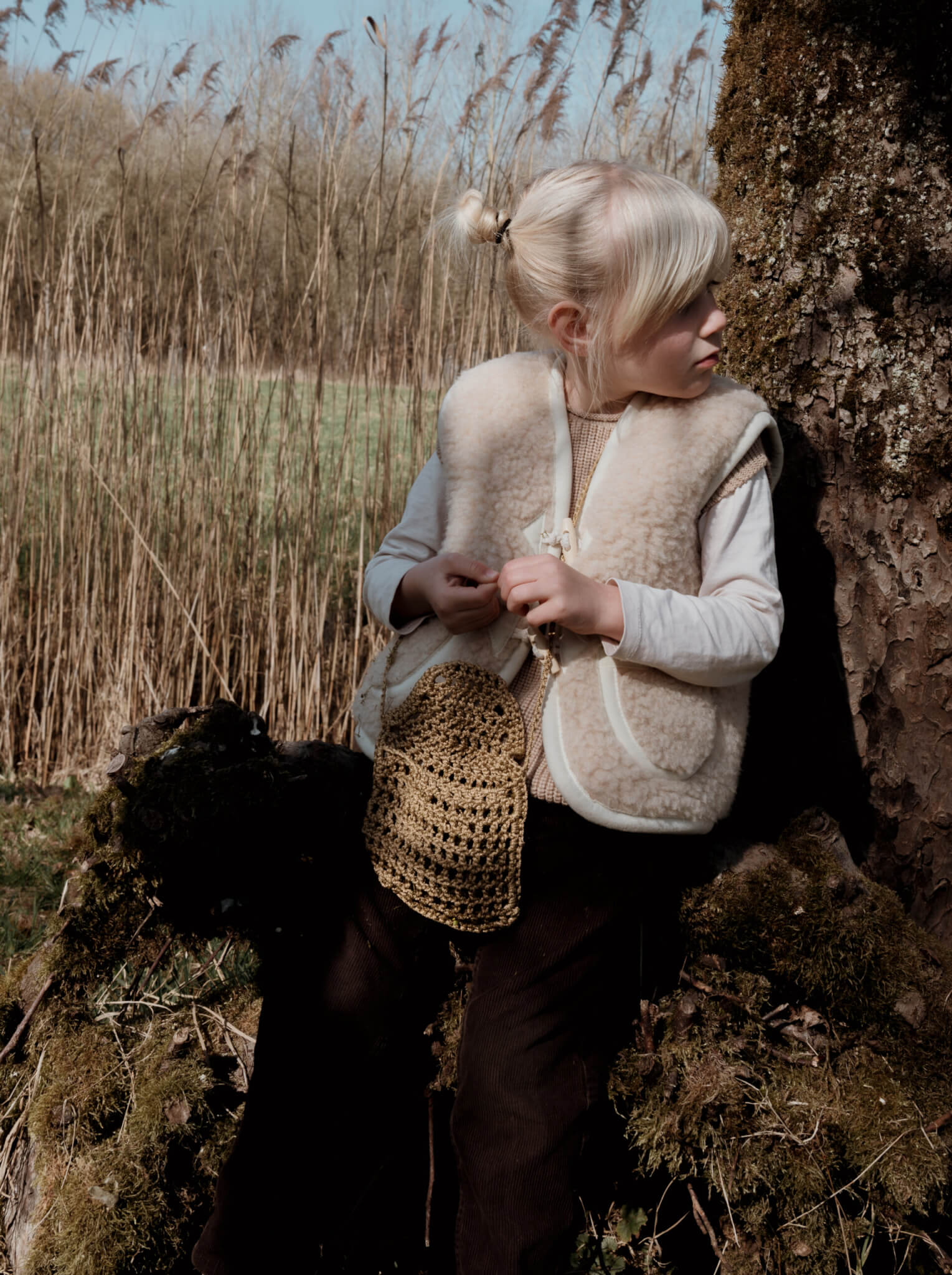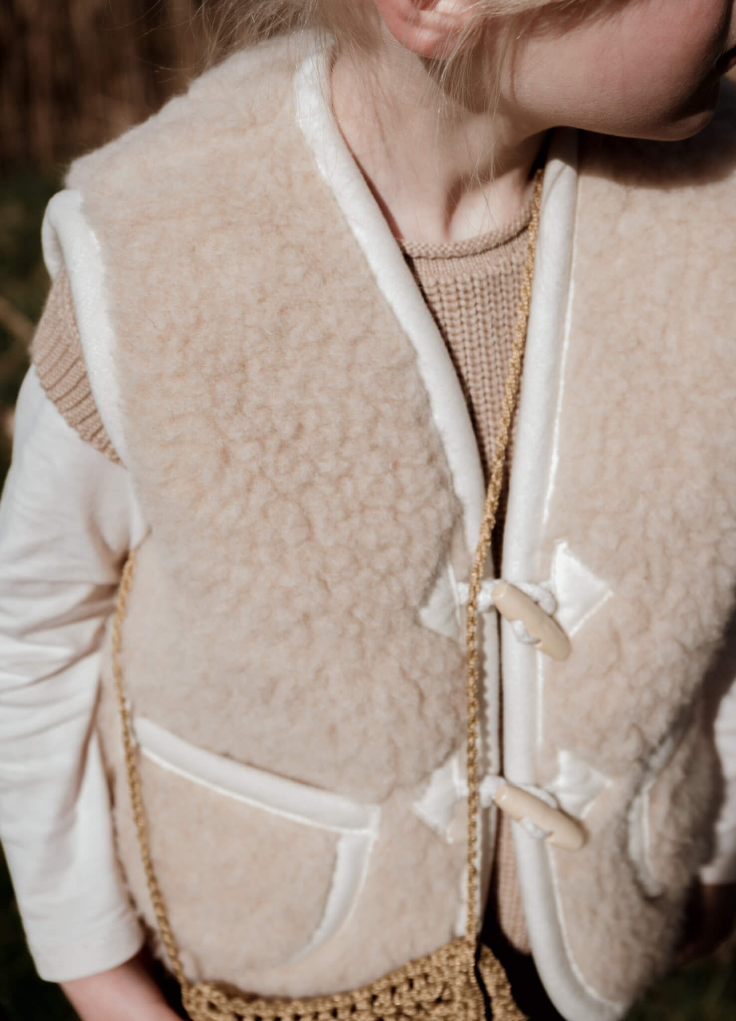Vanaf maat 110/122: sluiting met twee houten touwtjes.