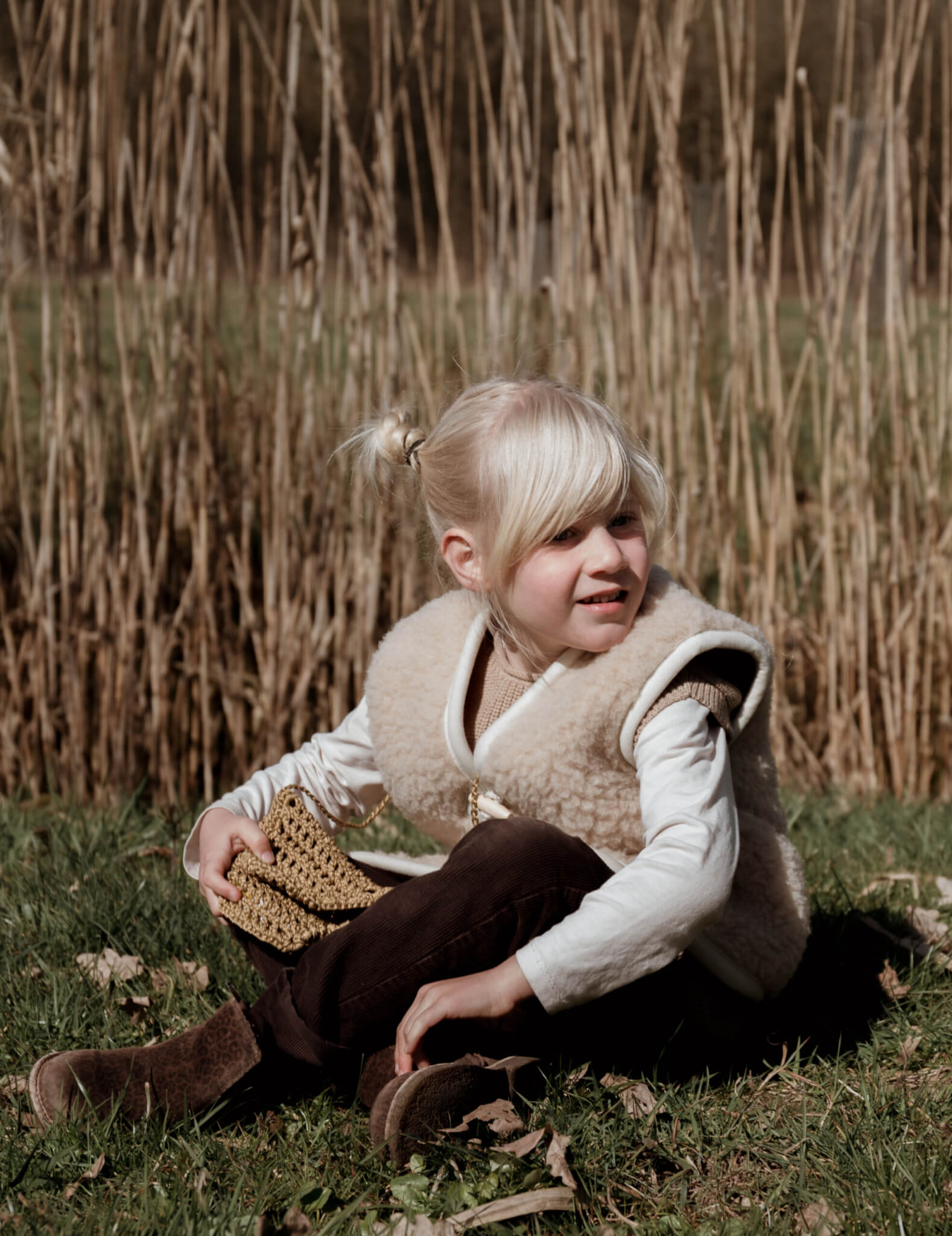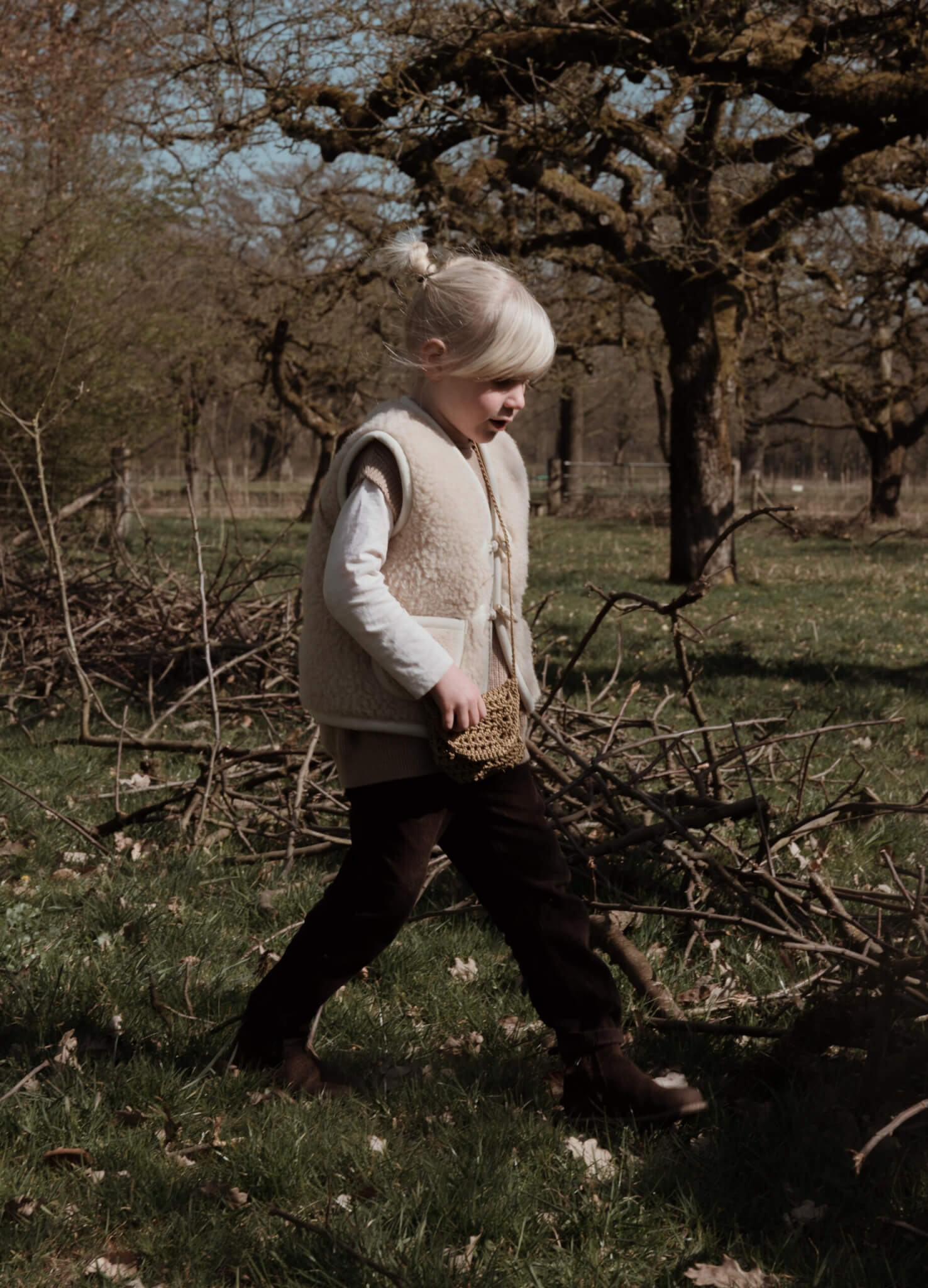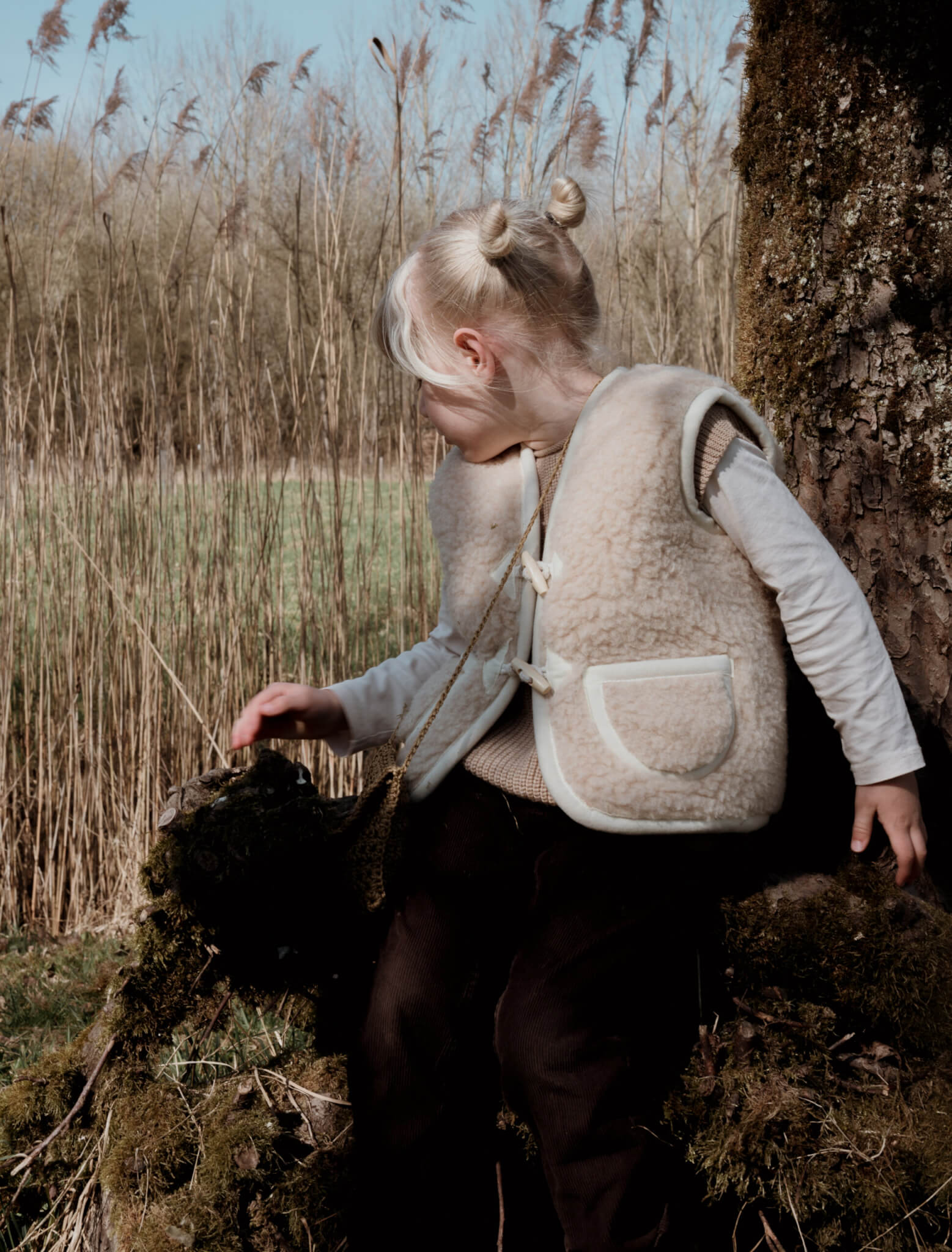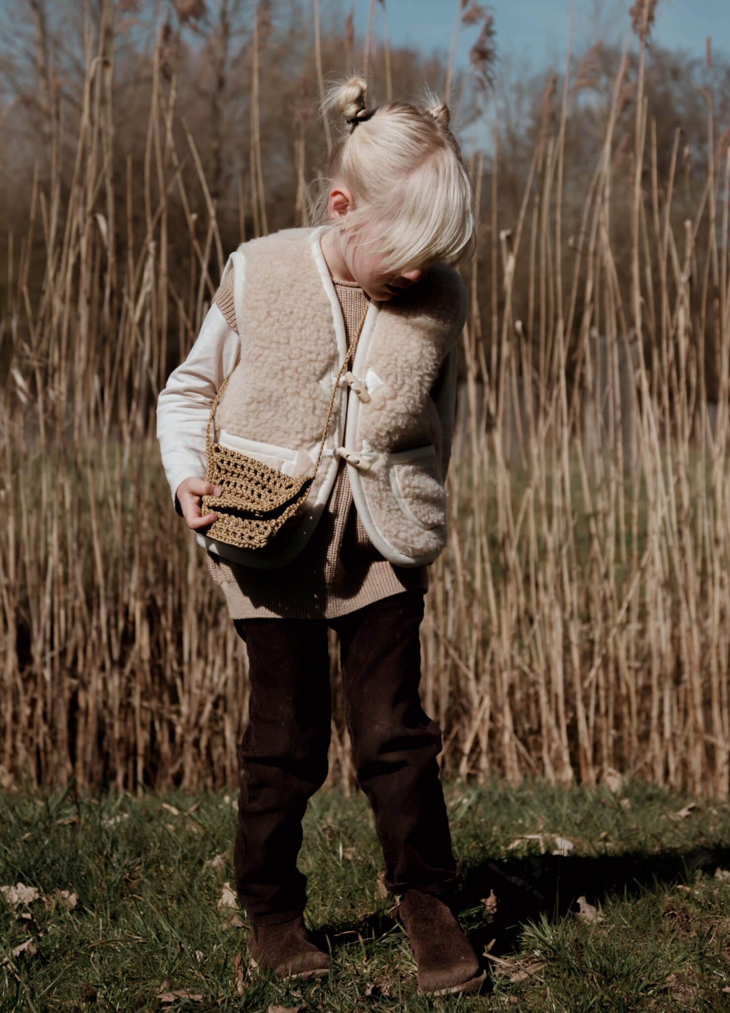 Vanaf maat 110/122: sluiting met twee houten touwtjes.
